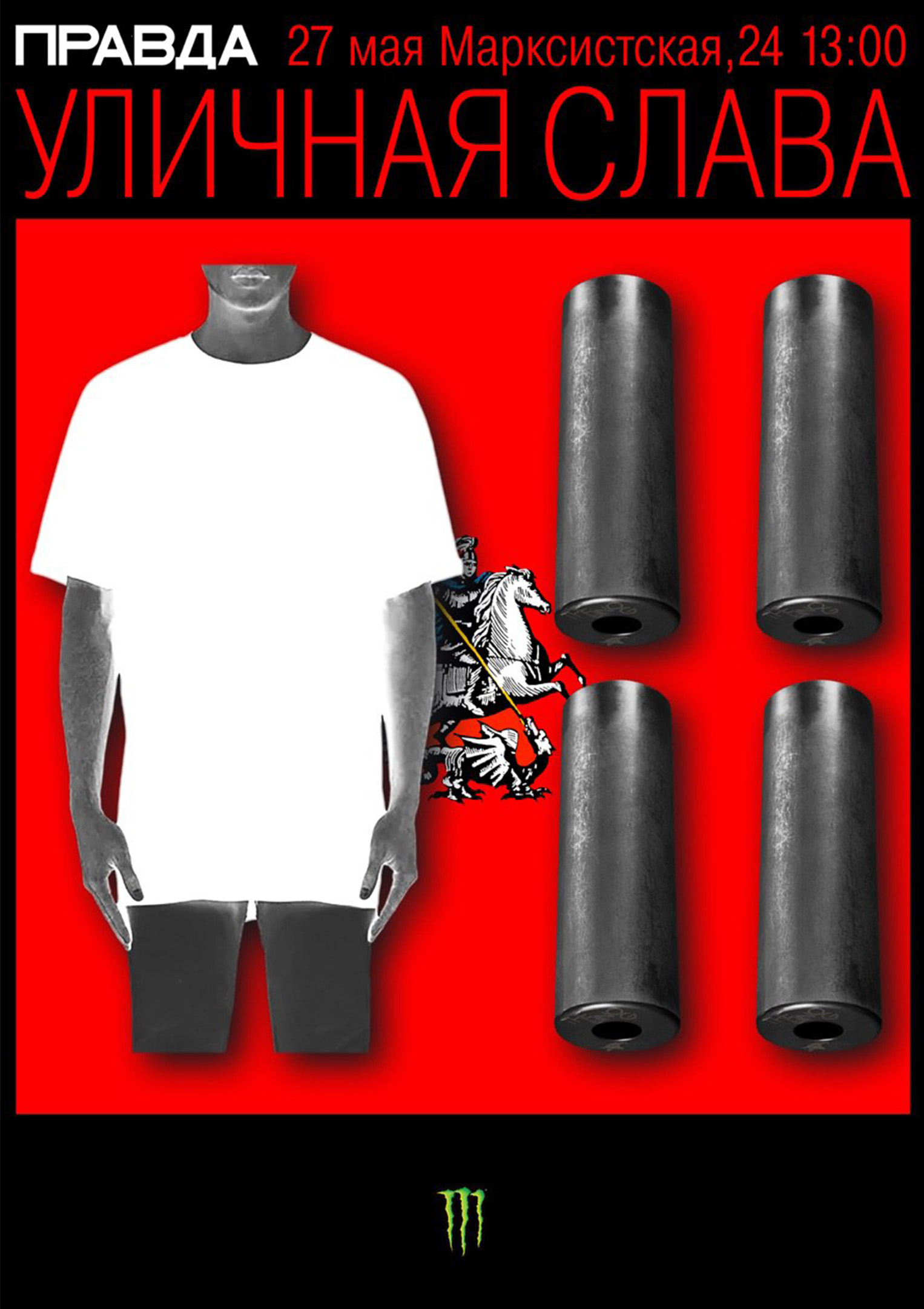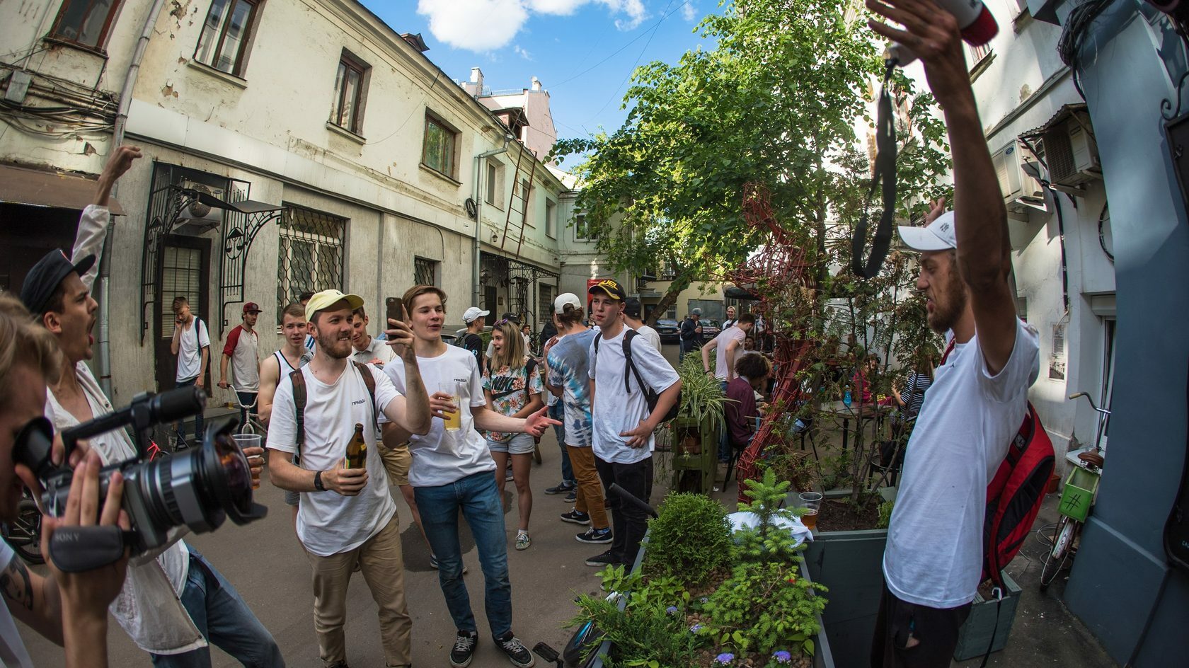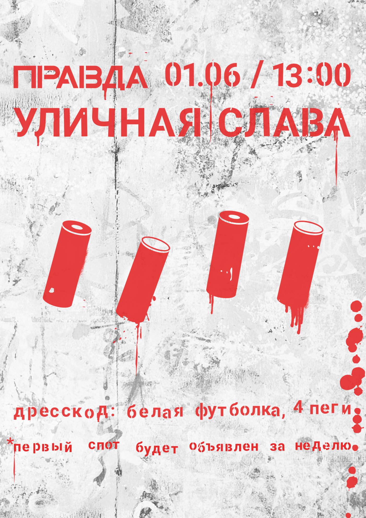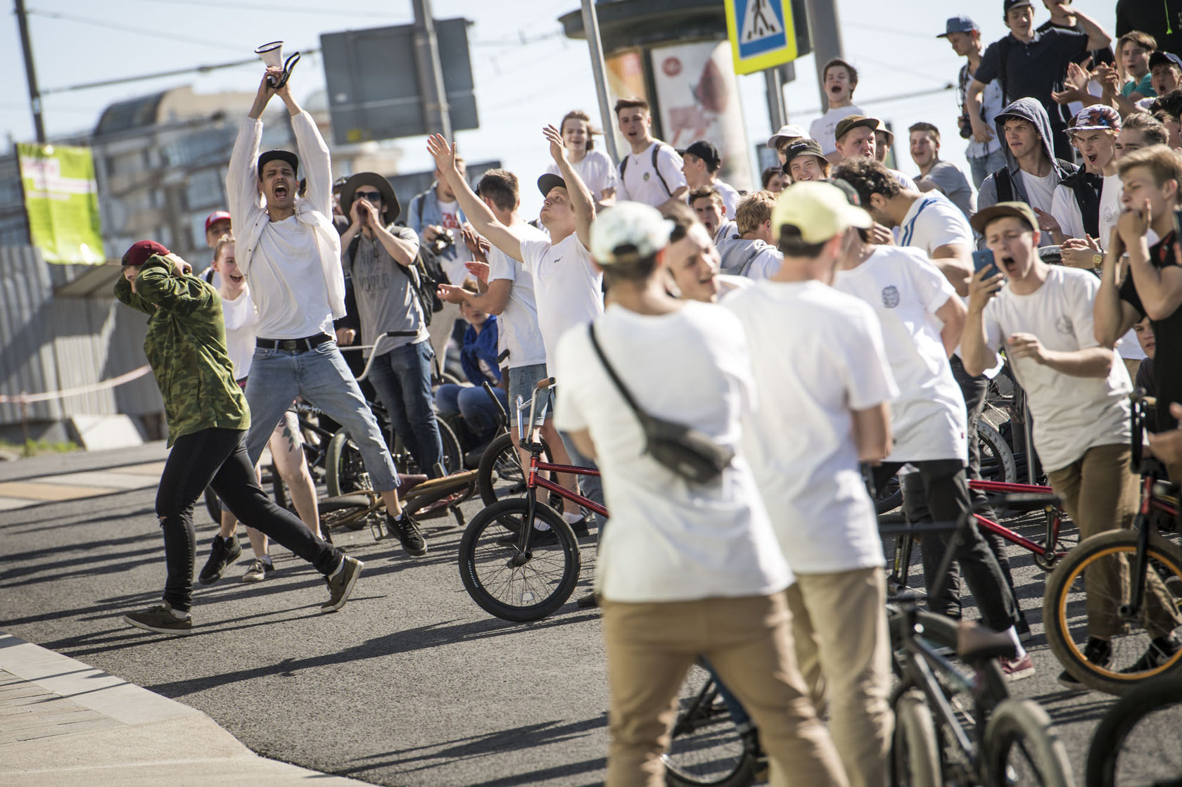 Everyone who wants to participate comes by keeping the dress code of white oversized t-shirt and four pegs. The crowd follows along a pre-planned route which usually has four or five spots. The route is guided by our permanent host Gleb Kropotov. With his charisma, he always turns on the crowd. Every trick made on a spot is awarded with cash money prize.